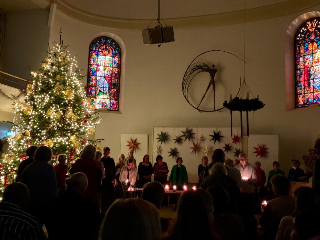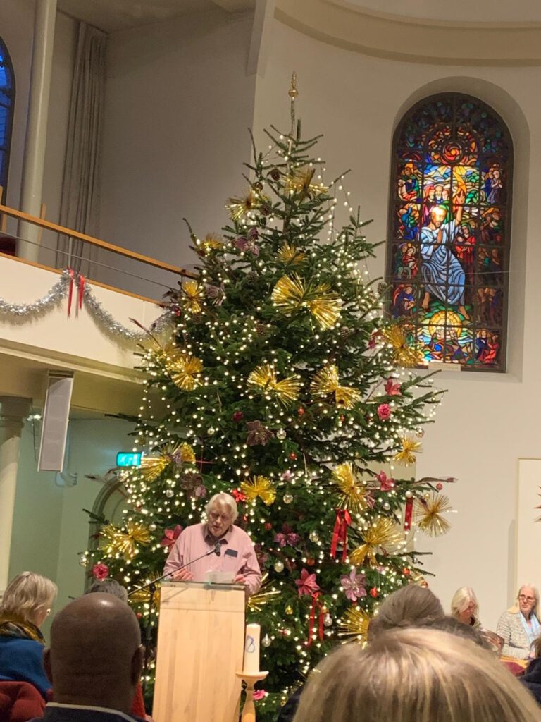 Wij waren te gast in de Doopsgezinde Kerk in Groningen. Bij binnenkomst werd de blik van de meer dan honderd bezoekers onmiddellijk gevangen door een fantastische kerstboom, fantastisch qua omvang en fantastisch qua versiering. Prachtig decor voor een lichtfeest.